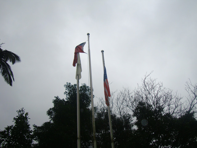 今天下雨這裡操場旗竿上的國旗、美國國旗及新北市旗(搞不好還是臺北縣),無法迎風飄揚。