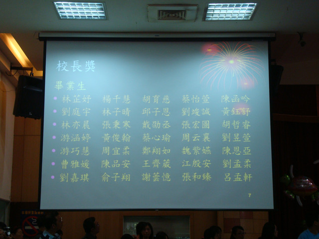 典禮會場的投影板顯示對各位獲獎的同學的祝福。