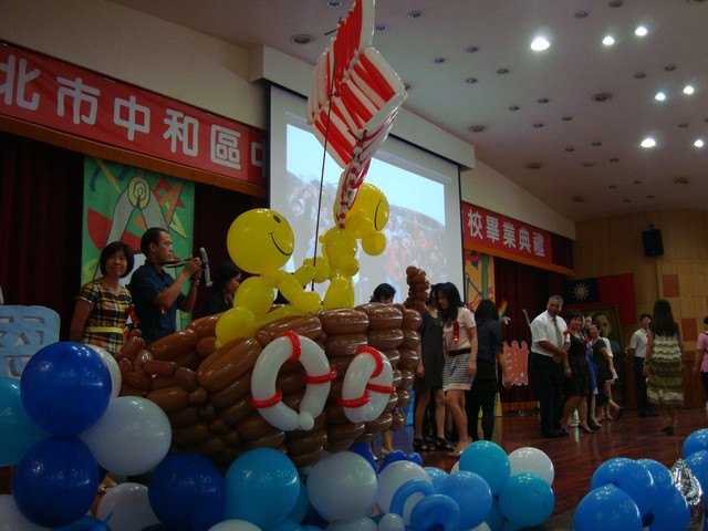 六年級各班導師接受學生獻花祝福,大女兒獲她班上同學推選為獻花代表,會場的氣球佈置很不錯。