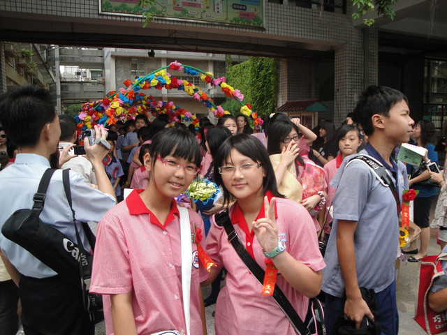 出校門前大女兒跟她班上的好友呂孟軒拍照留念。