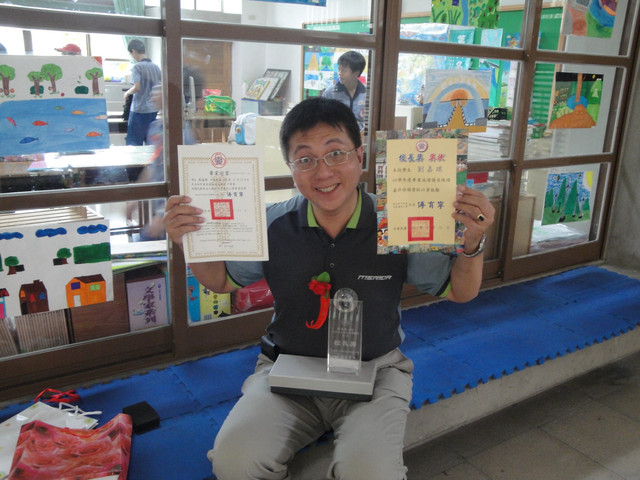 先領取校長獎獎品(紅色袋子),結果裡面是刻有得獎者姓名的校長獎獎座,真是太棒了。
