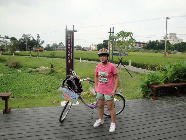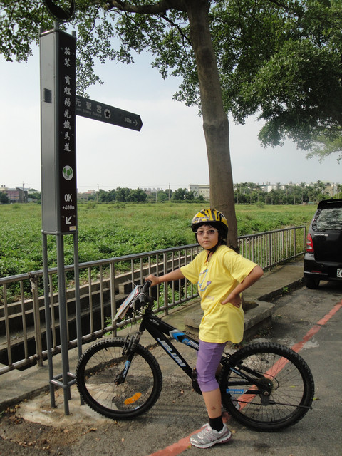 看到這個新穎的「茄苳霄裡陽光鐵馬道」標示,當然我們父女三人要拍張到此一遊的獨照啦!