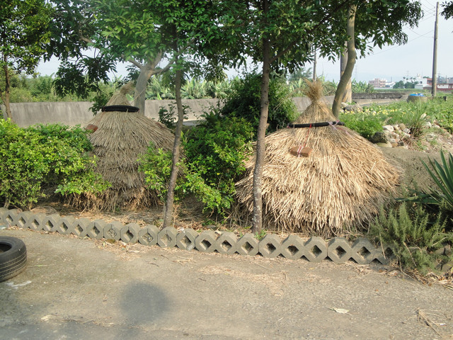 路旁農家堆積而成的兩個稻草堆,目的不知道是好看,還是真的有農業用途。